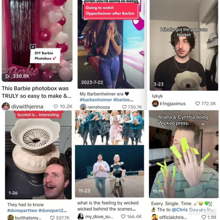 这股短视频宣传旋风始于2023年的《芭比》。据Fast Company报说念,《芭比》营销的创意公司Midnight Oi总裁比尔·罗森塔尔称,电影上映前,不雅众可进去拍照打卡的“芭比盒子”装配便在tiktok上走红,赢得了10亿次不雅看。