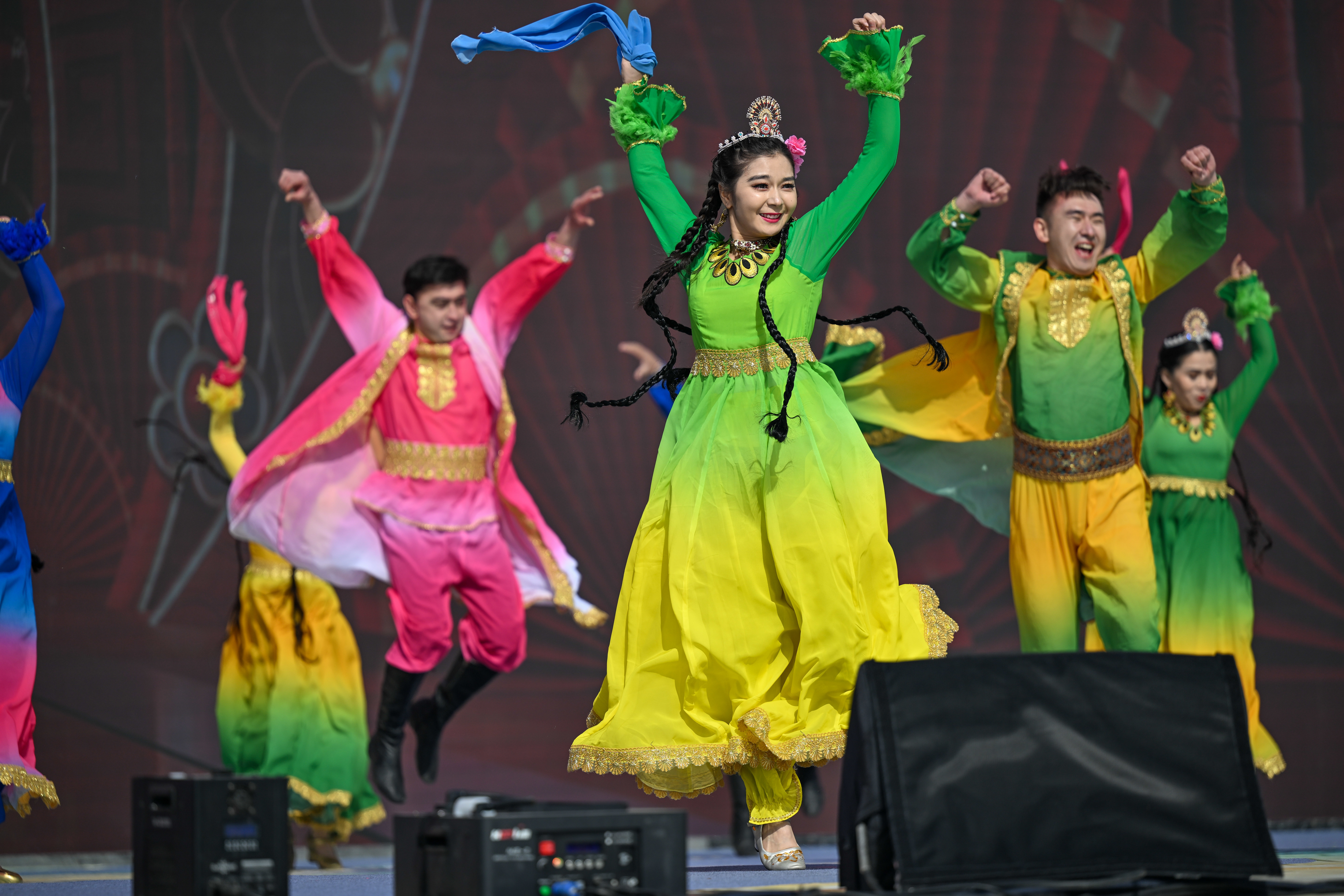 3月20日,在新疆吐鲁番市托克逊县南湖杏花村,演员为旅客和当地住户饰演跳舞。
