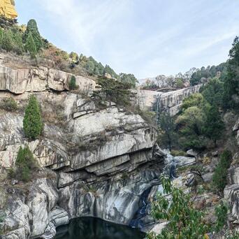 沿石阶一齐拔高,约走路1.5小时,可到达扇子崖售票处,票价2.5元,阁下即是太始天尊庙。再进取,很快就会到达扇子崖下。扇子崖相近傲来峰,玉皇顶等群峰环绕,成群结队。