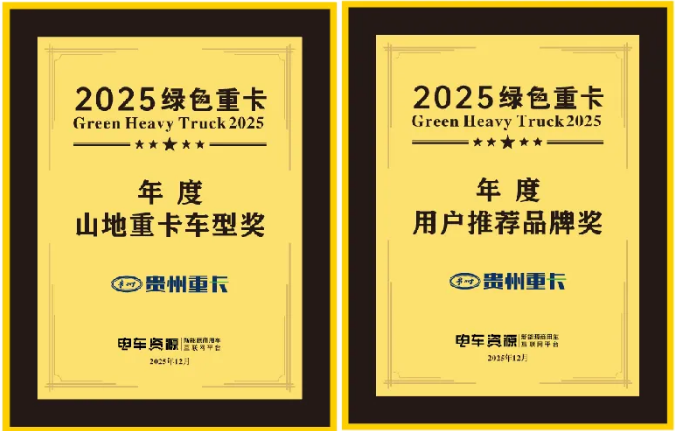 举止现场,贵州长江汽车有限公司旗下“贵州”牌重卡凭借不凡的产物质能、邃密的用户口碑及提高的场景化革命上风脱颖而出,一举斩获“2025绿色重卡年度用户推选品牌奖”“2025绿色重卡年度平地重卡车型奖”两项重磅奖项,以硬核实力再获行业高度招供。