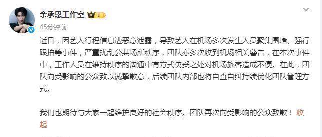 对此,余承恩使命室发文讲明原由称艺东说念主行程信息遭坏心露出,导致艺东说念主在机场屡次发生东说念主员连合围堵、强行跟拍等事件,严重侵扰各人所在递次。还默示:“团队向受影响的公众致以赤诚歉意,后续团队里面也将自查自纠握续优化团队解决姿色。”