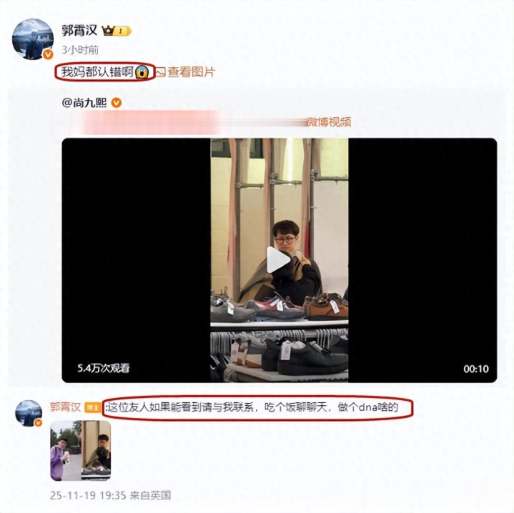 德云社郭霄汉晒聊天截图,伦敦遇“双胞胎”弟弟,长相、心境一模相同,就连郭母都以为这是郭霄汉本东说念主。这段偶遇,来自郭霄汉的搭档尚九熙。其时,尚九熙亦然被畏俱。边录,边嗟叹,从上扬的声调也能感受到来自九熙的诧异。郭霄汉把视频发给母亲,母亲更是莫得第一时辰识别,还冷漠郭霄汉成功领追念。伦敦偶遇“双胞胎”弟弟,何如这样巧呢?事情是何如回事呢?