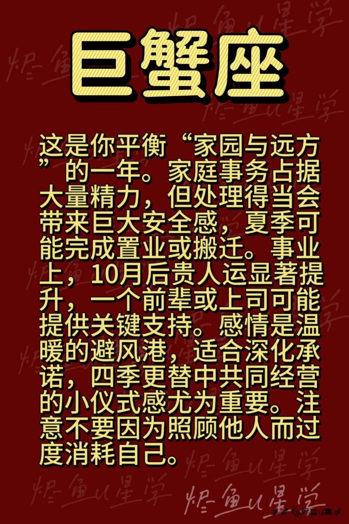 巨蟹座:安全感从来齐不是在某一个东谈主身上不错取得的,安全感源于我方广泛的内心,新的一年,尝试着我方广泛起来。