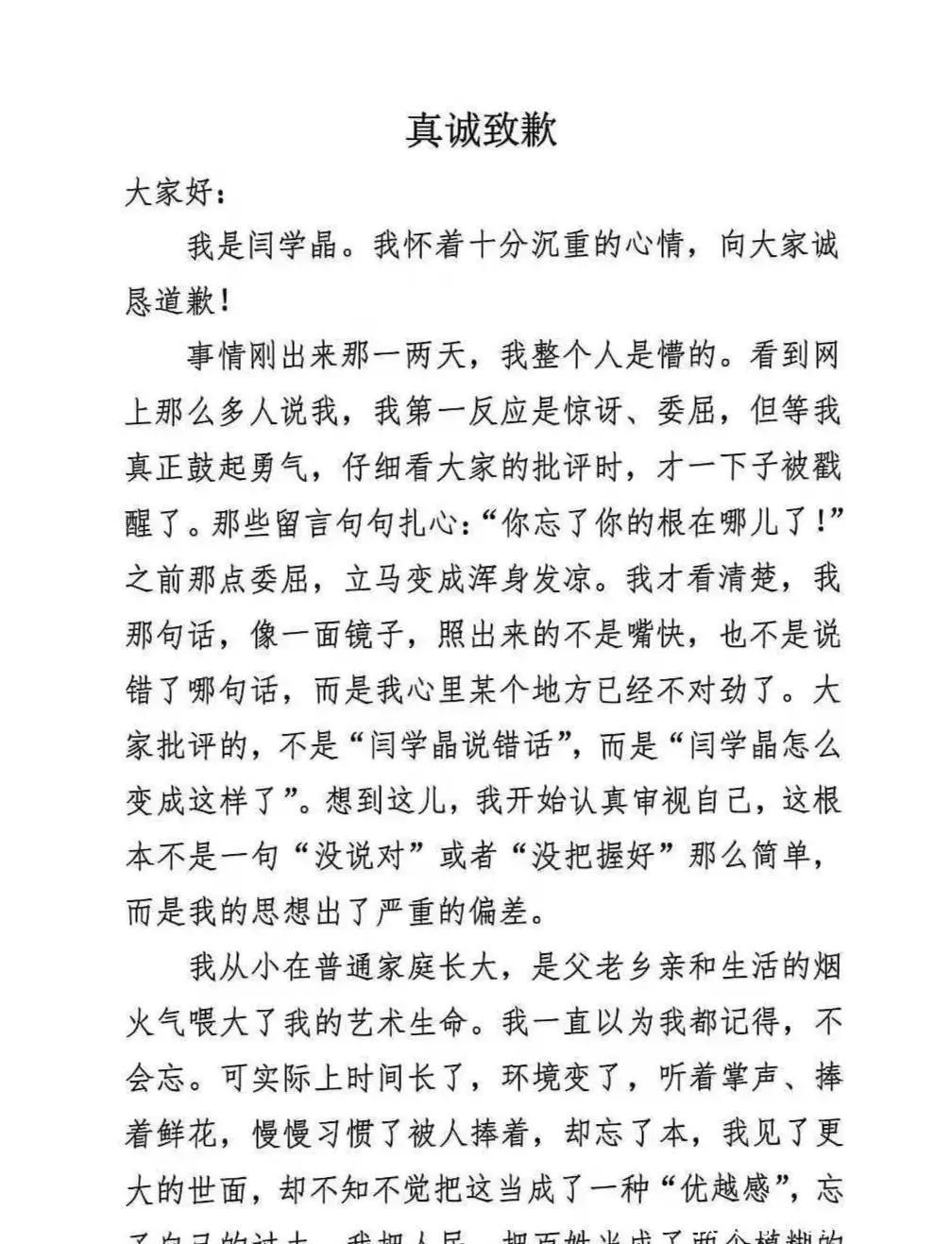你好开云kaiyun体育,目生东说念主愿你以梦为马,不负此生。2026丨1.12要是可爱,就点个☆星标吧!1月11日,也曾因为“哭穷”言论深陷旋涡的闫学晶终于发布长文致歉,承认了我方“想想出现严重的偏差”、“习尚被捧着忘了本”。我是看着她的《刘老根》《俺娘田小草》长大的不雅众,我也曾一度把屏幕上朴实的形象与本东说念主绑定,在我心里她的地位照旧挺高的,但是关于这份迟来的说念歉,却没能让我宽心,不是因为我残忍,而是这3点原因,简直是让我无法应酬汲取。