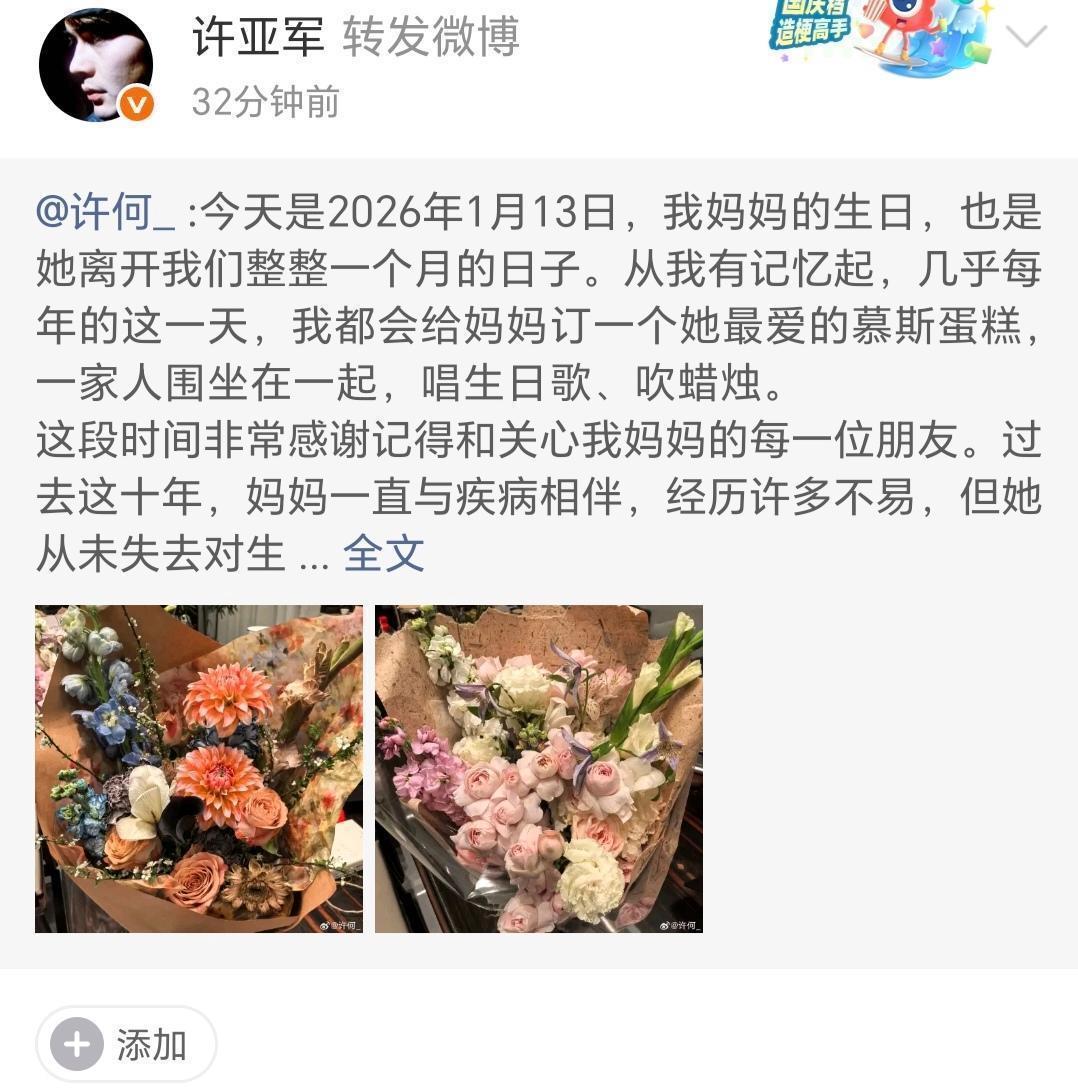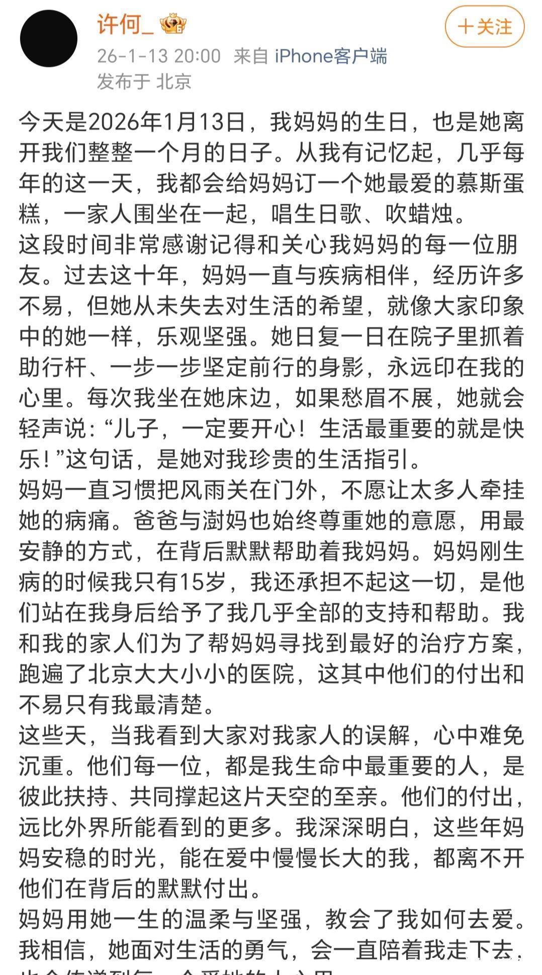 本日,恰逢她离世一月,许何发布了一封情深意切的长信。这封信,既是对母亲的担心,亦然一次对家庭里面花式真相的暖热清晰。