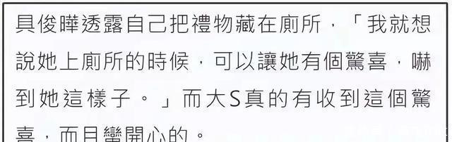 莫得对比就莫得伤害,大S具俊晔成婚第三年,又到了大S的生辰,具俊晔一雪前耻,运转放大招了。 具俊晔先是买了价值十万块的著名品牌手环藏在茅厕,等大S上茅厕的期间发现,然后又给大S手绘了一幅画,上头写着具俊晔对大S的深情表白。