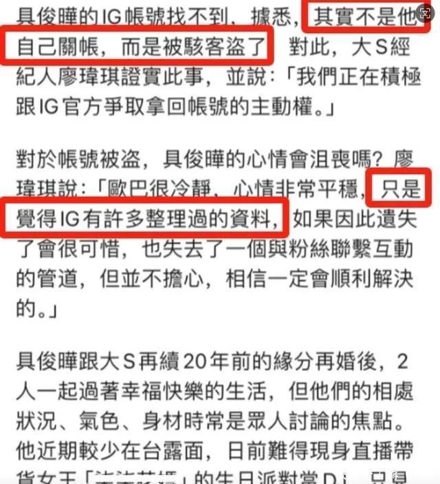 具俊晔高调秀恩爱,其实是为了告诉全宇宙, 他和大S情谊并莫得变淡,反而越来越好。 之前有网友发现具俊晔取关大S刊出了外交账号,怀疑他们婚变,很快大S牙东说念主否定婚变听说,具俊晔也诠释是被盗号。