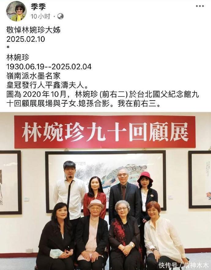 林婉珍的亲一又也发文诋毁,证明她在本月4日物化,并晒出了2020年林婉珍举办90总结展的合影。合影中有林婉珍的子女、媳孙,以及妹妹。