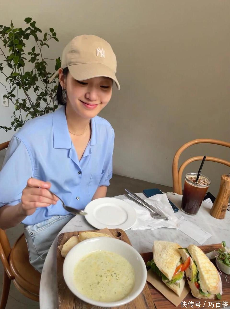 除了粉色单品外,金高银也会偶尔尝试蓝色系,淡蓝色平翻领衬衫搭配水洗蓝气质牛仔,节略利索又有性价比,盛大外穿外出毫无压力。